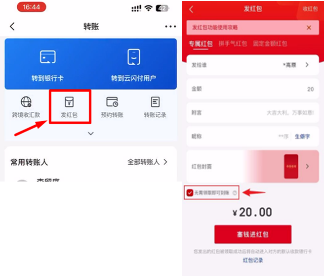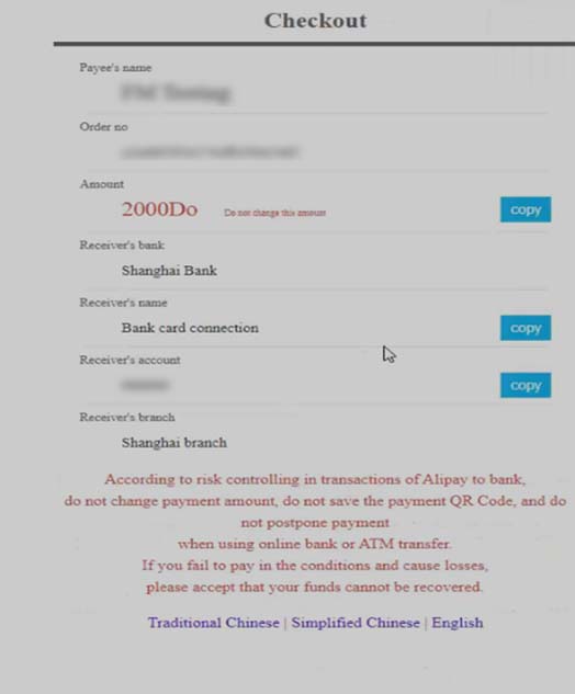 - amount of payment must same with requested, please remember to tick the[无需领取即可到账] so the fund will auto credit to user account