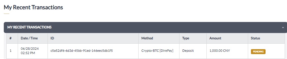 - Choose DirePay, Input Deposit Amount and click submit. Note: The exchange rate stated is indicative. The actual rate and amount credited can only be determined after submission of the transaction.
