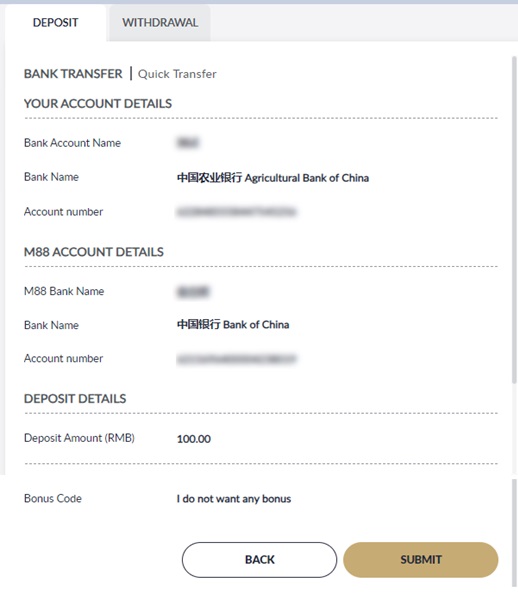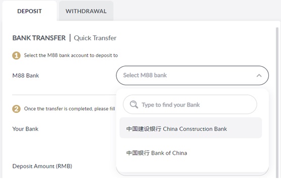 Quick Transfer tutorial to get M88 Bank Account Number.