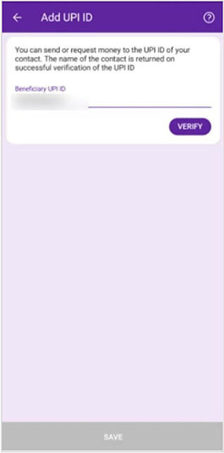 Insert the UPI address from step 3 and click VERIFY. Save the UPI Account by clicking SAVE